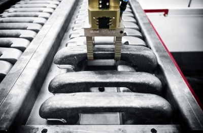 During the milling process, the robot picks up the milled component from the intermediate storage and deburrs the sharp milled edges. The robot arm guides the component precisely along the deburrer.