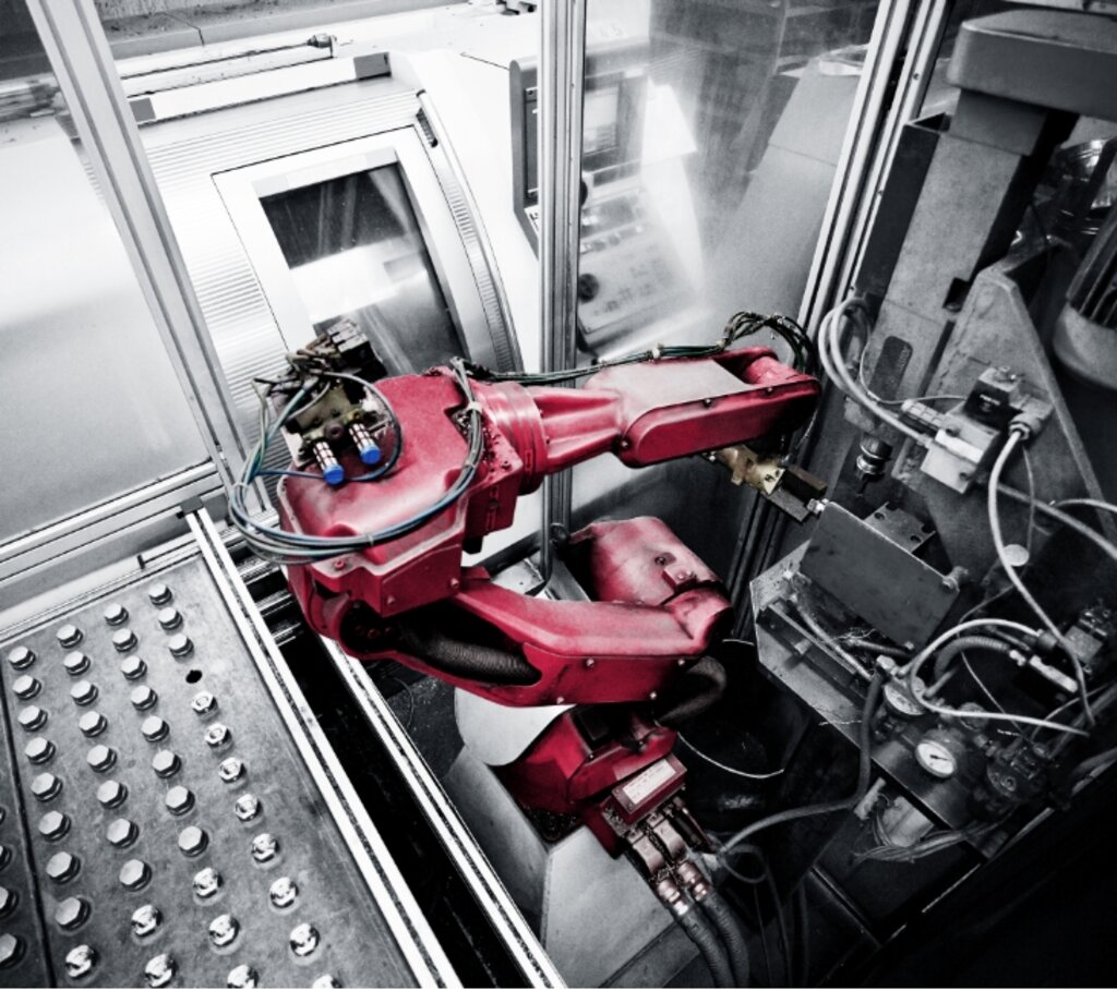 Once the turning process is complete, the robot removes the finished workpiece with a gripper, rotates the gripper by 180° and loads the blank into the lathe chuck via the second gripper.